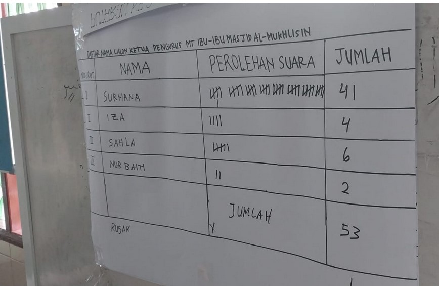 Pemilihan dilaksanakan dengan cara memberikan kertas kecil kepada seluruh anggota majelis taklim yang hadir, agar menuliskan nama atau nomor urut calon yang tertera di whiteboard yang sudah disediakan. Berdasarkan Absen, ada 54 anggota majelis taklim yang hadir saat pemilihan.